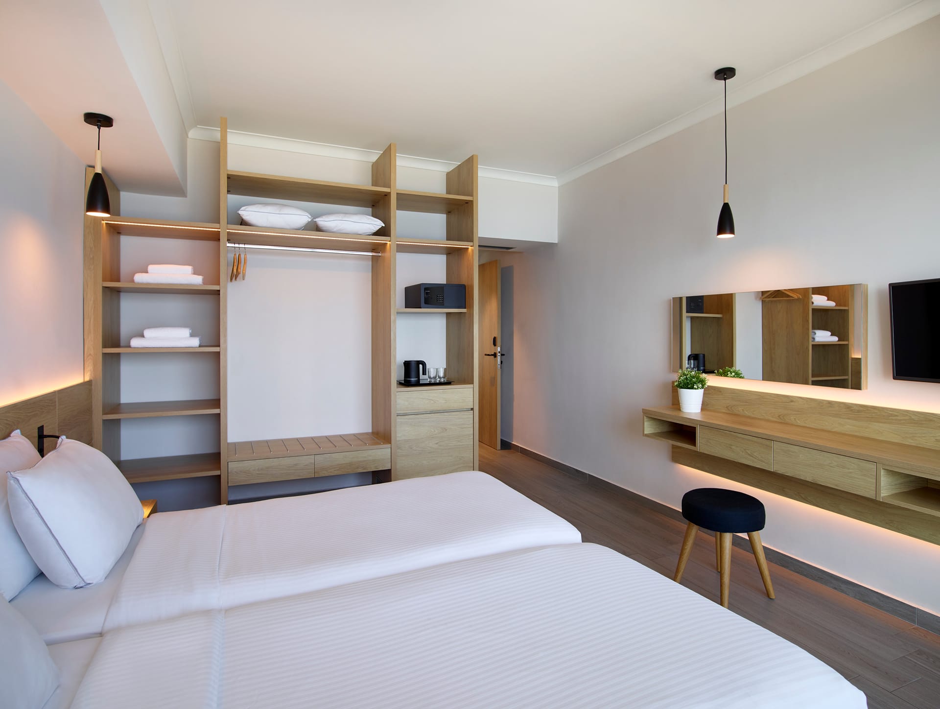 The fresh, inspired design of the Rooms infuses each space with a genuine sense of welcome. Spacious and earthly colored, the Superior rooms feature unique modern furnishings and large windows. Its interiors are injected with an underlying mood of simplicity, aiming to highlight the surrounding beauty with their minimalistic flair, flavorsome decor and light wood furniture.